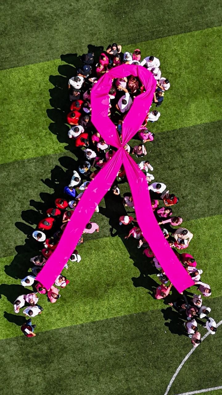 Durante el evento se ofrecieron pláticas informativas y se realizó la formación de un moño rosa humano, símbolo de unión y esperanza en esta lucha.