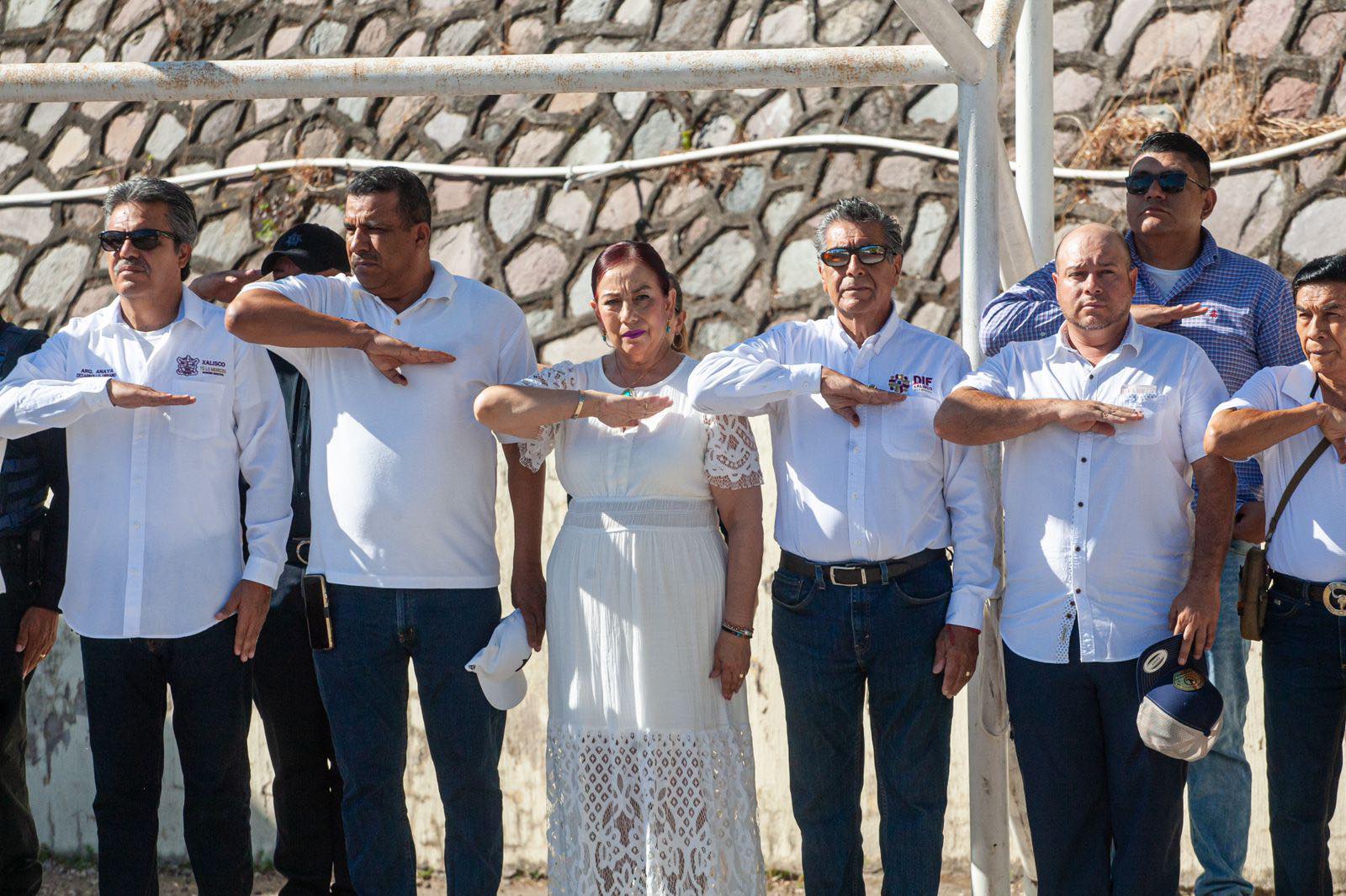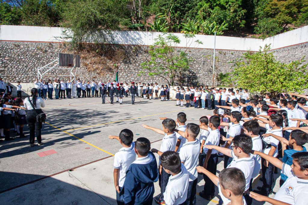 Con el propósito de fortalecer la vinculación educativa y promover valores cívicos entre la niñez de Xalisco, la presidenta municipal, Maestra Anabel Guerrero, encabezó los honores a la bandera realizados en la escuela Cristóbal Colón en el fraccionamiento Canoas II.