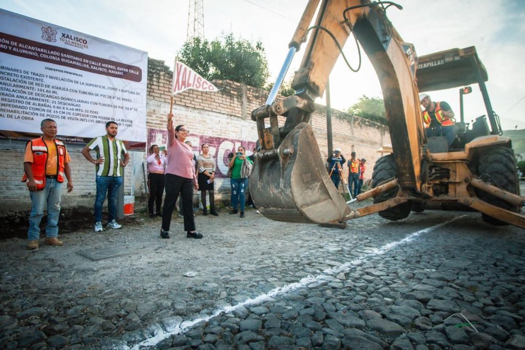 La presidenta municipal de Xalisco, Maestra Anabel Guerrero, acompañada por los regidores del Cabildo, dio el banderazo de inicio de la obra de rehabilitación del alcantarillado sanitario en la calle Hierro, de la colonia Bugambilias.