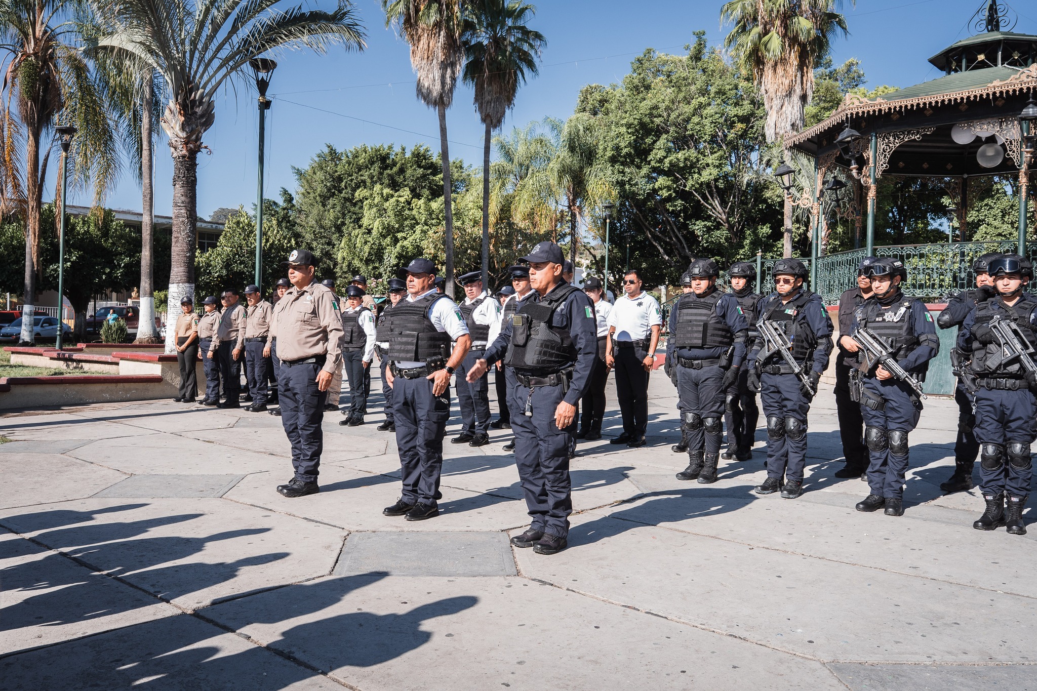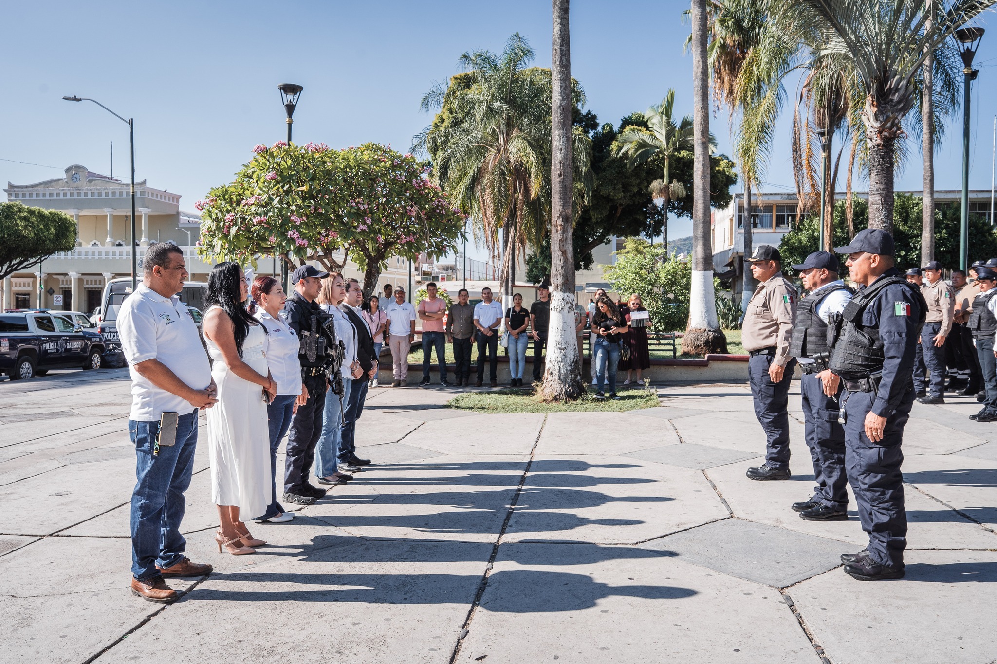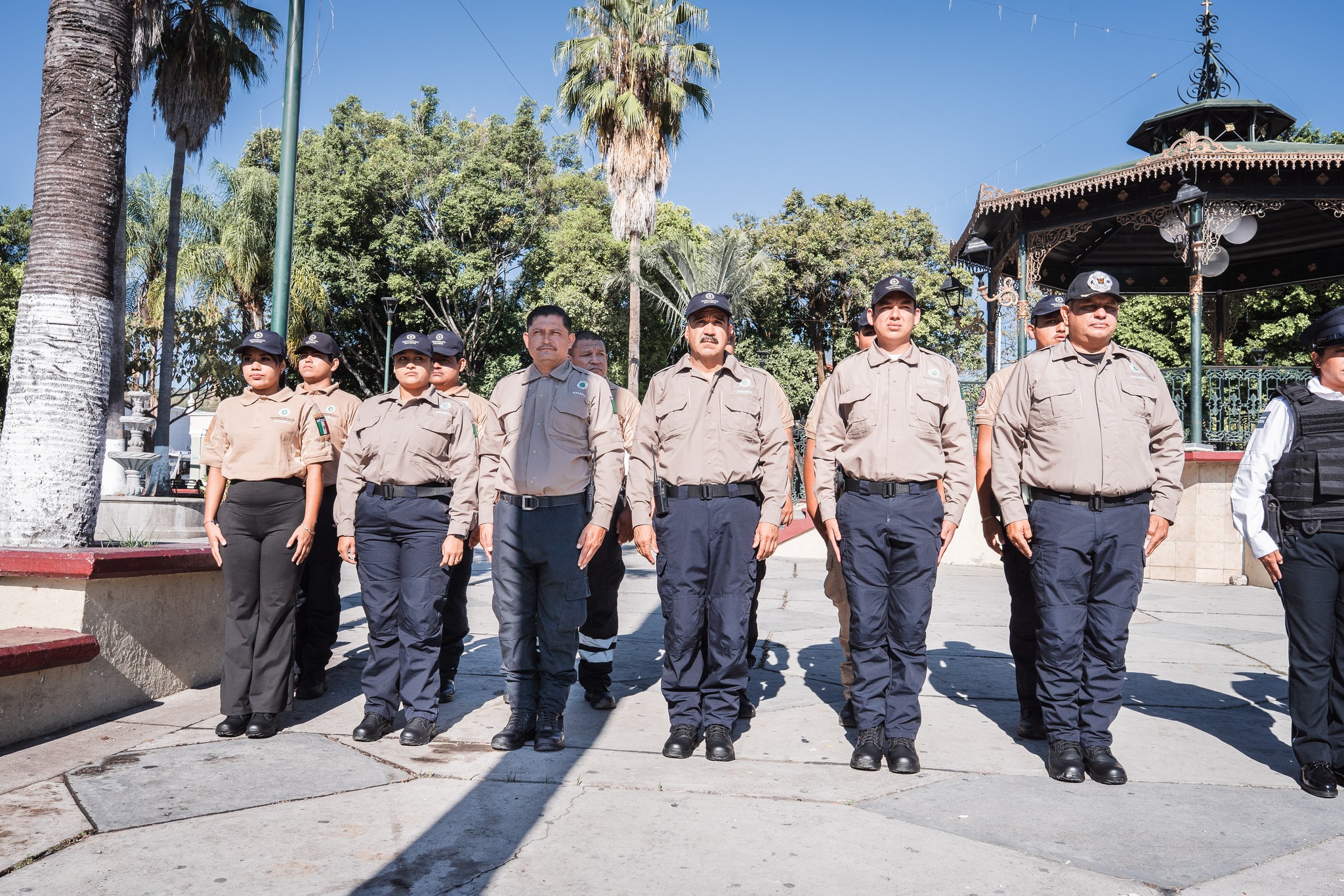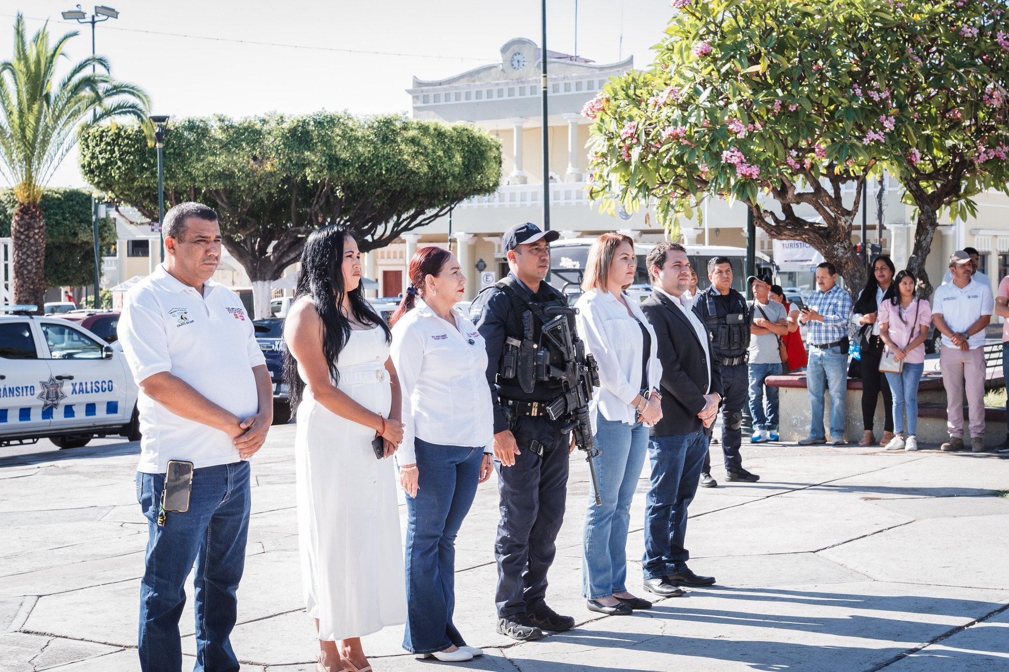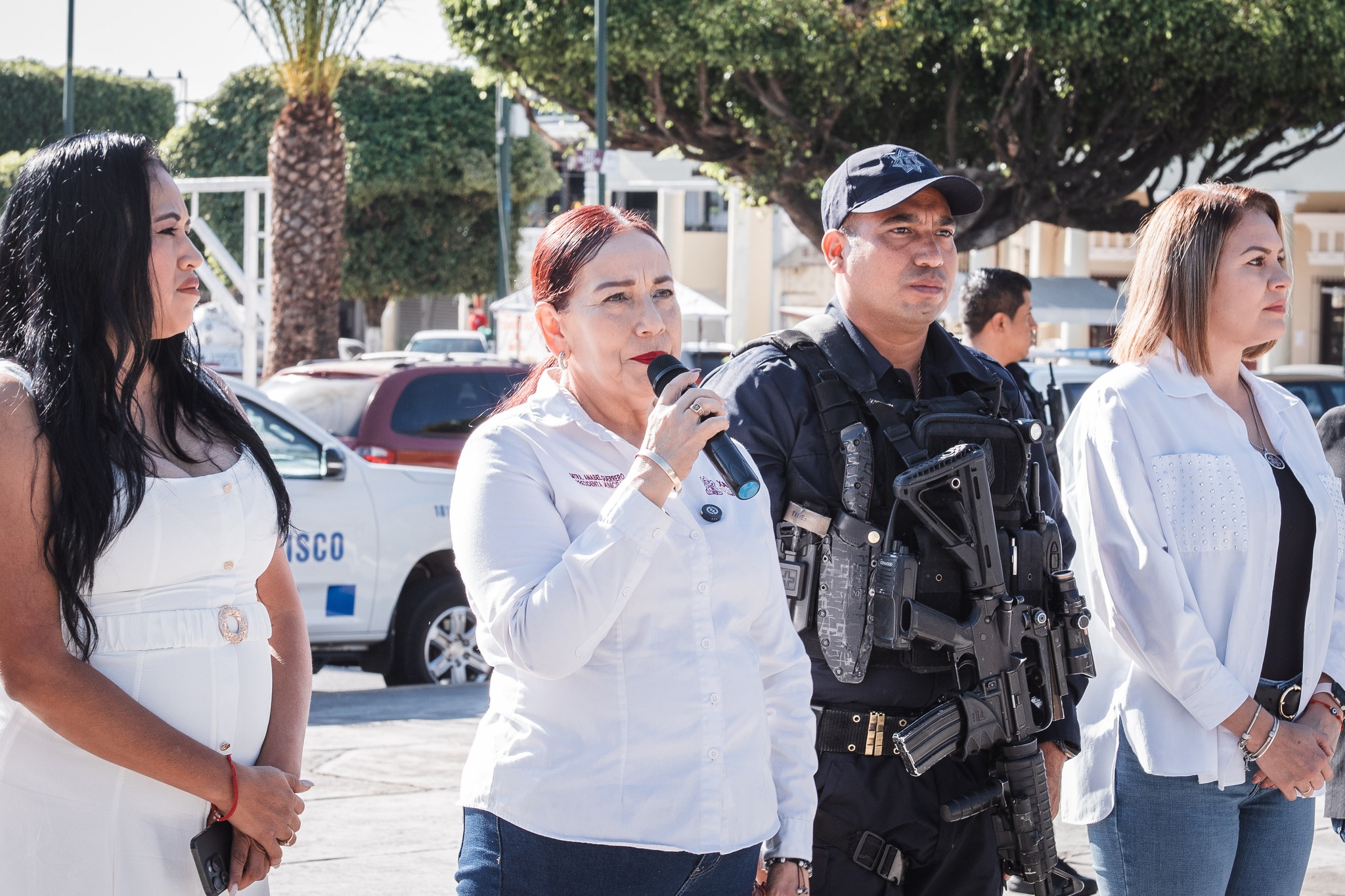 Durante el pase de lista a los elementos de la Dirección de Seguridad Pública, Tránsito y Protección Civil, realizado en la plaza Benito Juárez, la presidenta municipal, la Maestra Anabel Guerrero, reconoció la labor de cada integrante que, con dedicación, contribuye a mantener la tranquilidad de las familias de Xalisco.