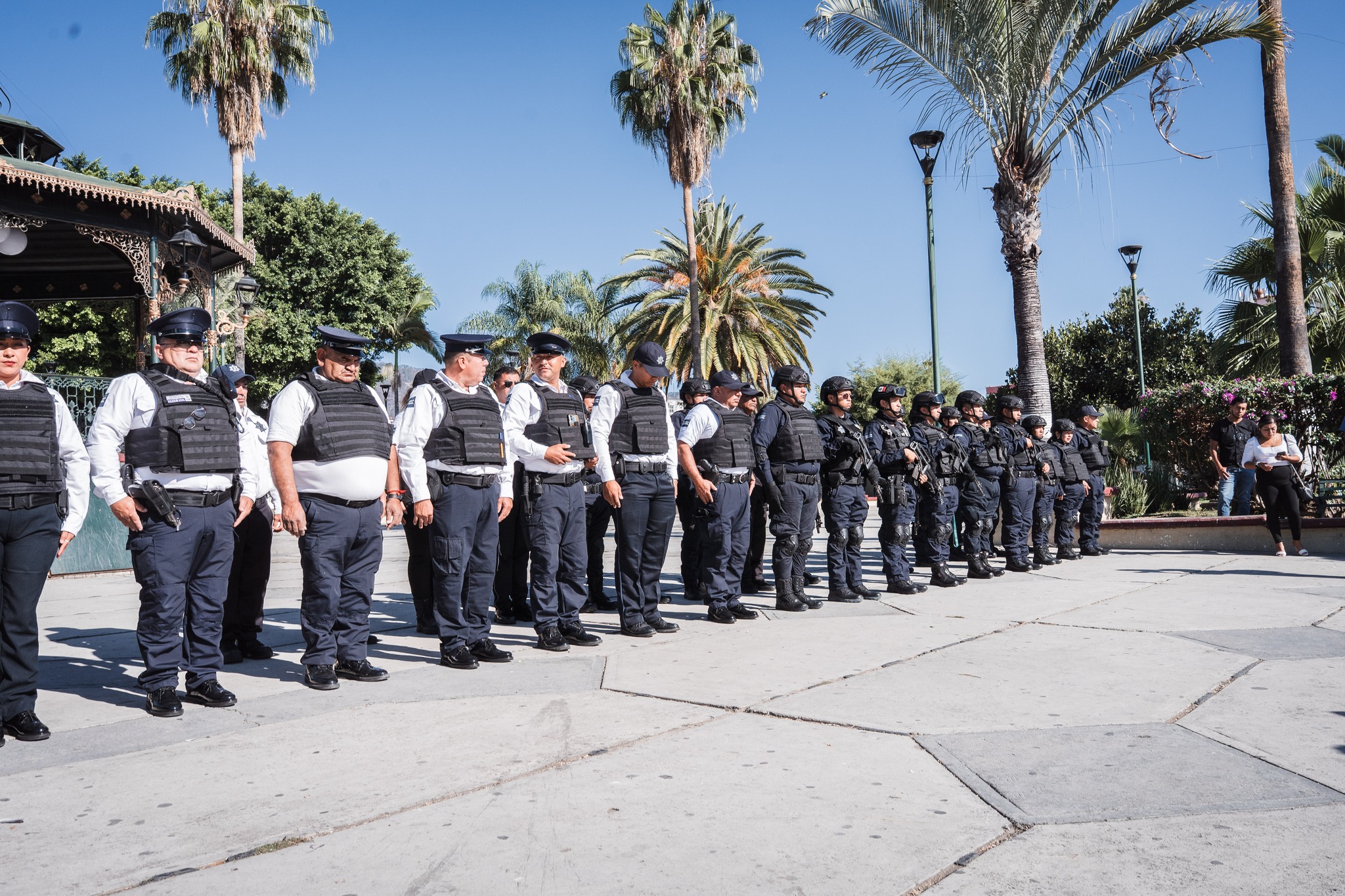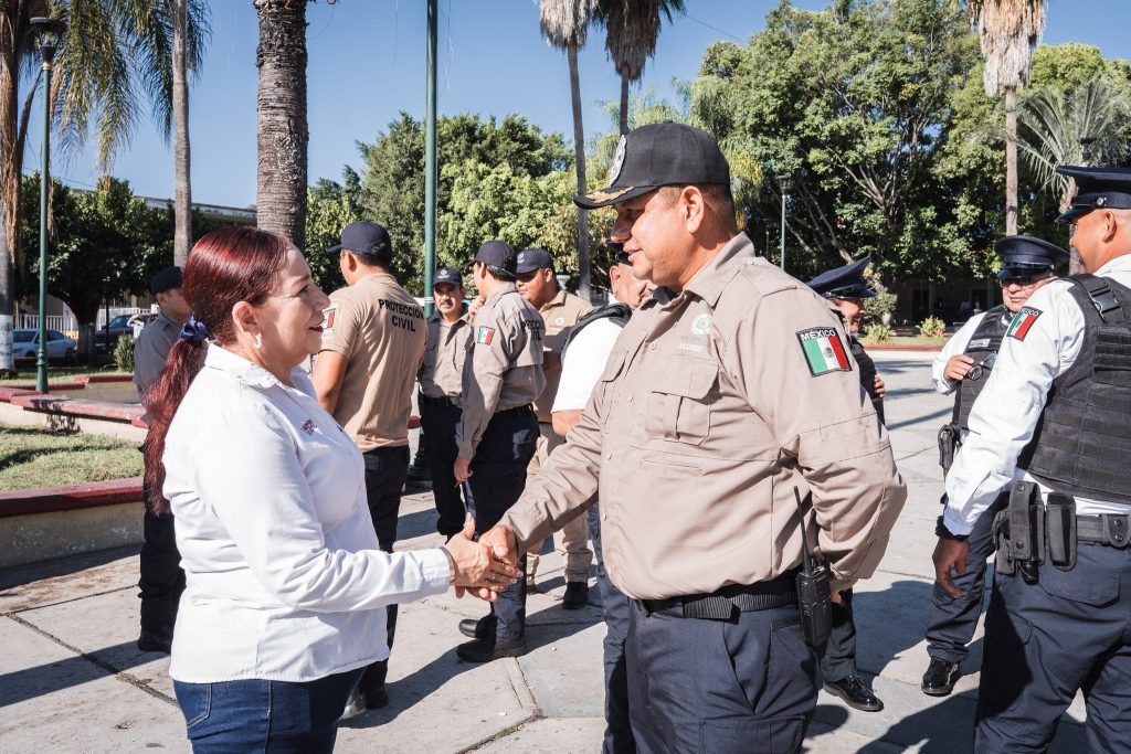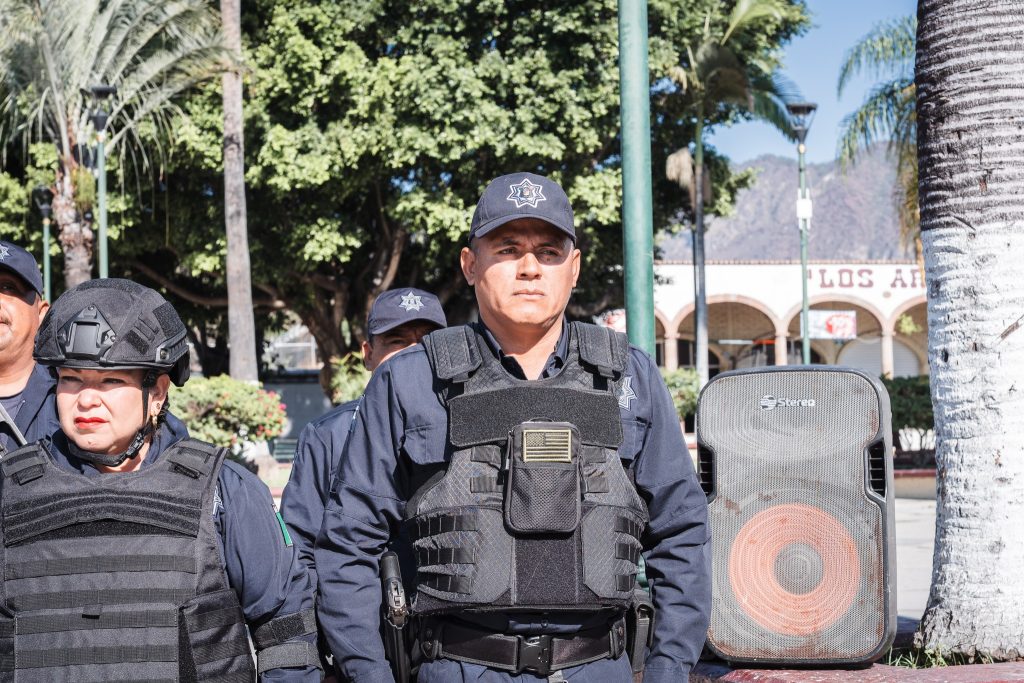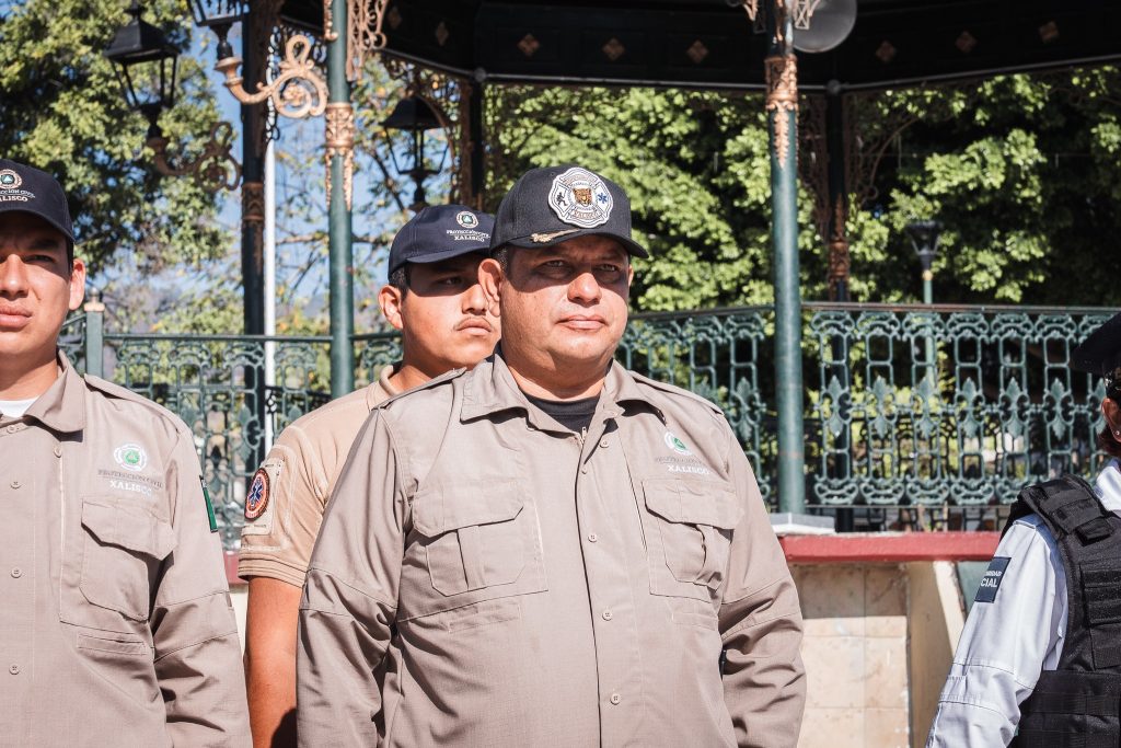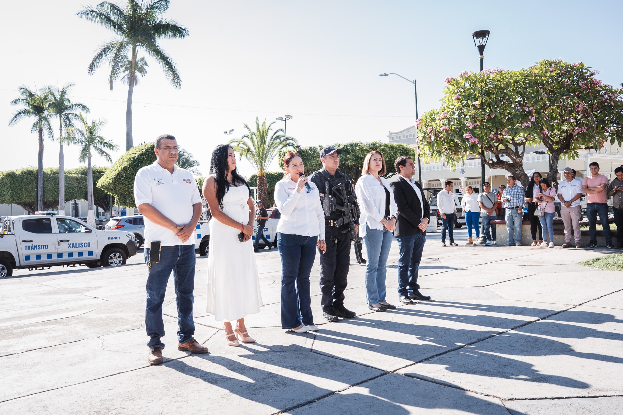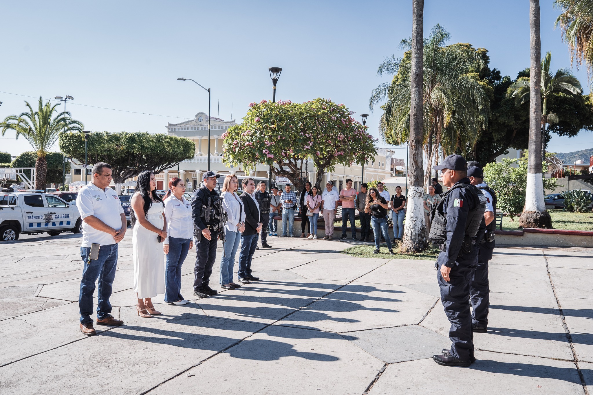 Durante el pase de lista a los elementos de la Dirección de Seguridad Pública, Tránsito y Protección Civil, realizado en la plaza Benito Juárez, la presidenta municipal, la Maestra Anabel Guerrero, reconoció la labor de cada integrante que, con dedicación, contribuye a mantener la tranquilidad de las familias de Xalisco.