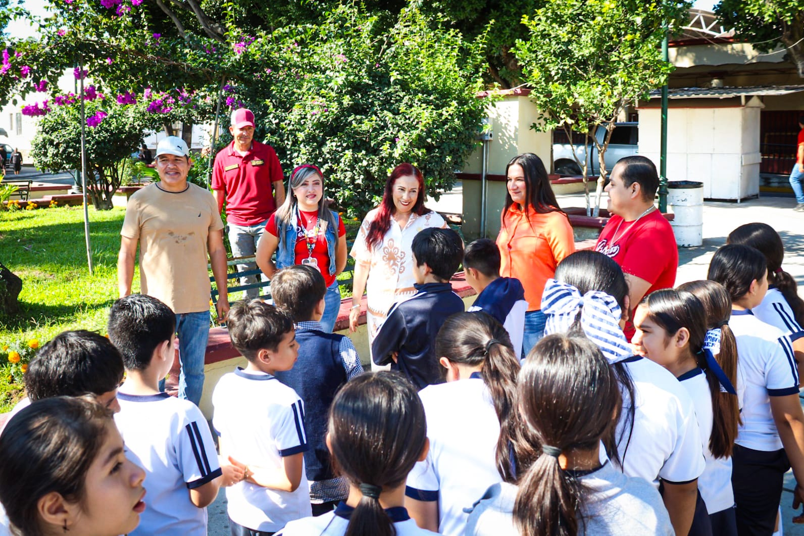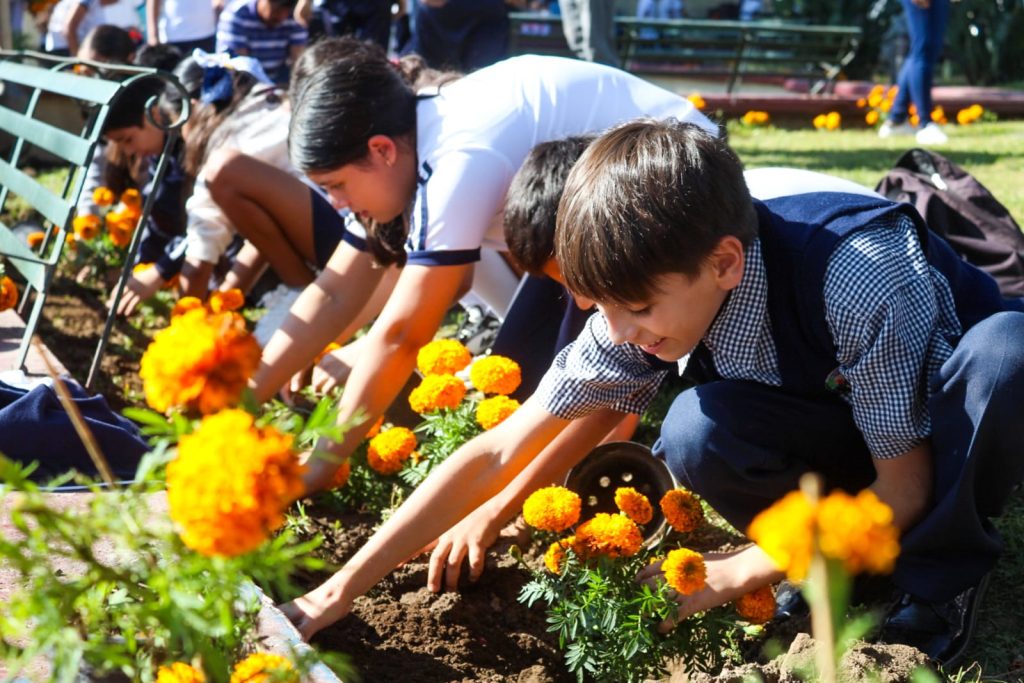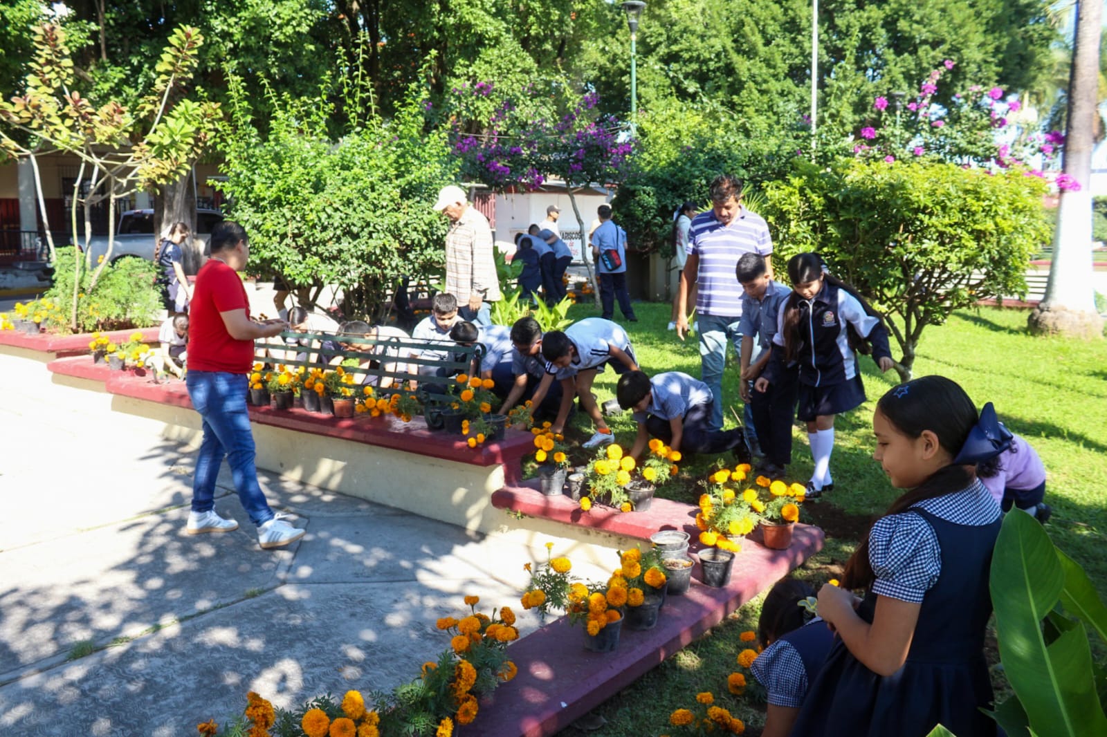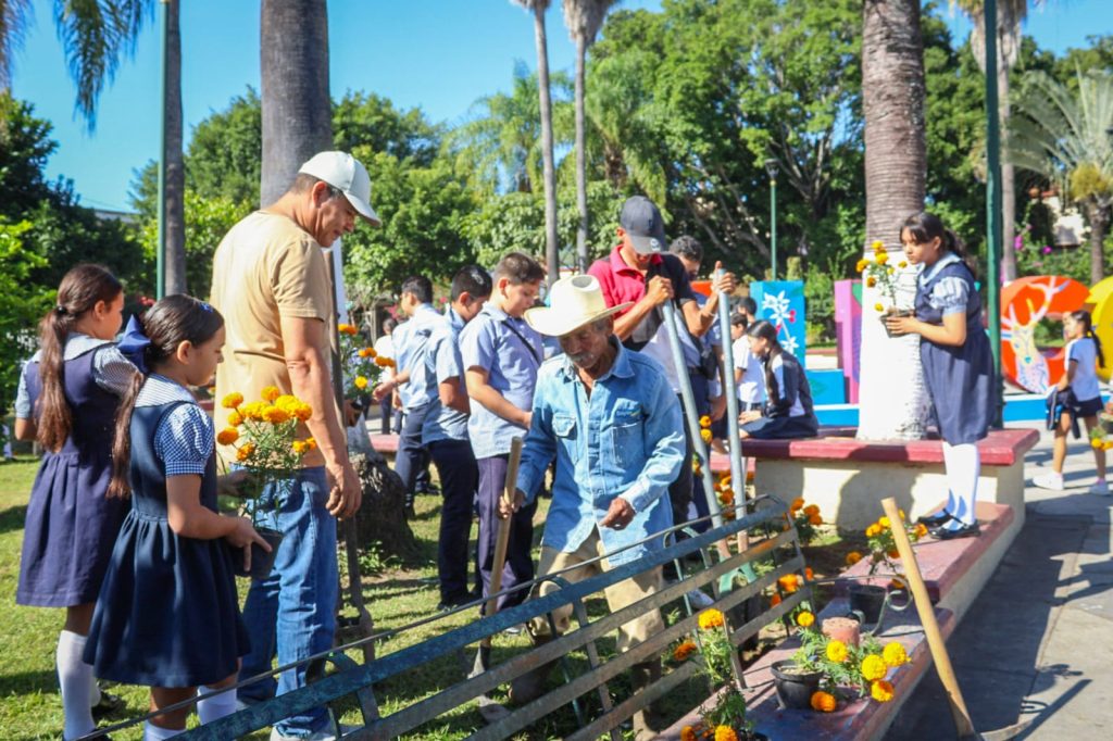De manera coordinada, la presidenta municipal de Xalisco, Maestra Anabel Guerrero, junto con estudiantes y directivos de la Escuela Primaria Lázaro Cárdenas, llevaron a cabo la plantación de flores de cempasúchil en las jardineras de la Plaza Benito Juárez.