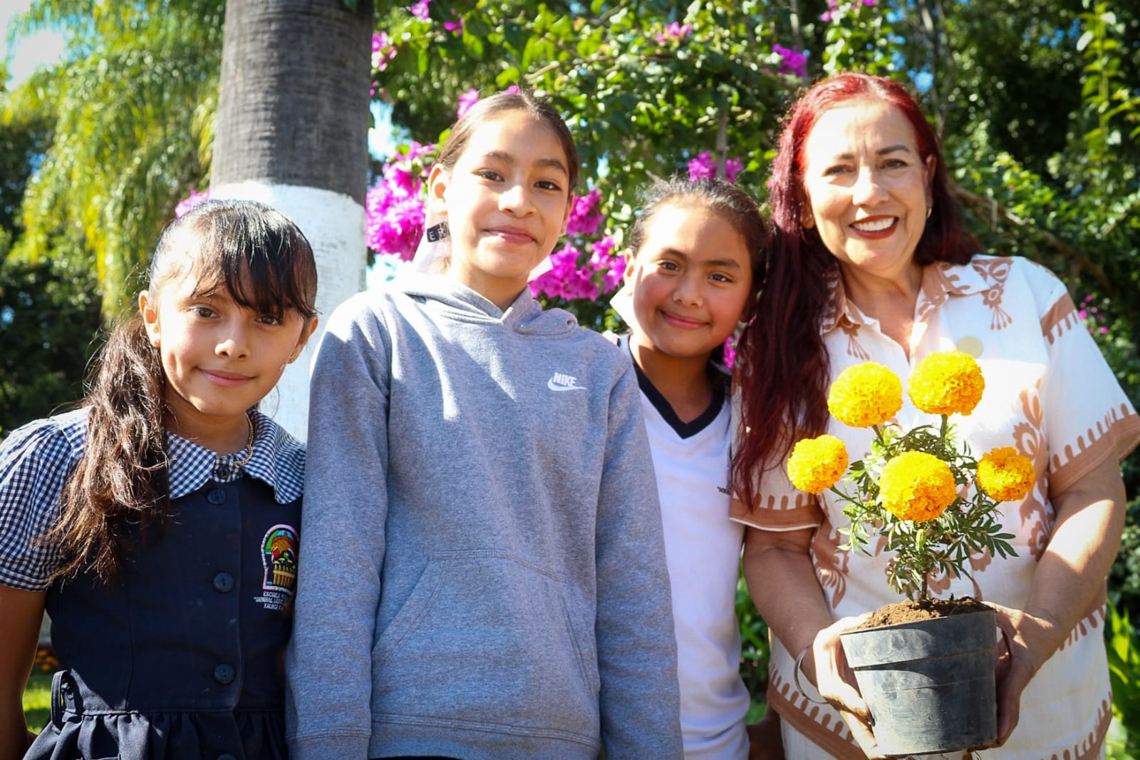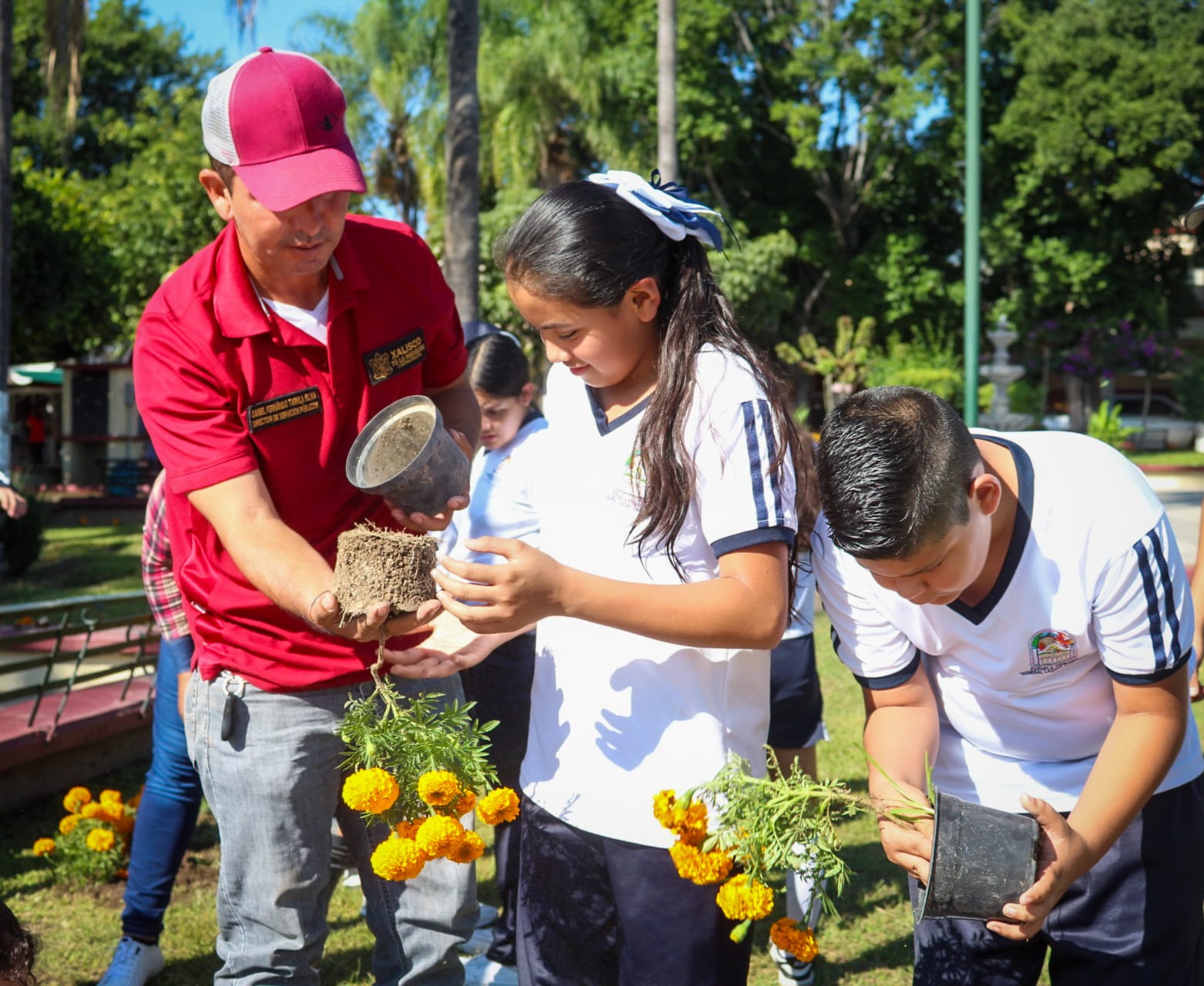 Durante esta jornada, los equipos de Servicios Públicos y Desarrollo Rural del Gobierno de Xalisco apoyaron a las niñas y los niños en la plantación de esta flor tradicional, que llenará de color y significado nuestra Plaza Juárez.